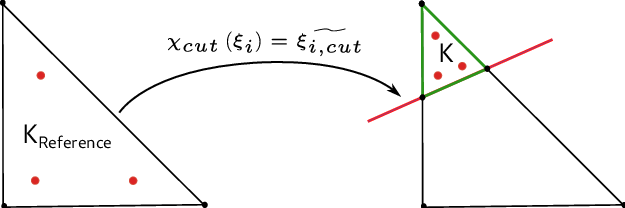We generate the quadrature rules over \(\Omega_K\) by sub-triangulation. For straight cuts in a triangle, this means either a triangle part or a quadrilateral part which we split into 2 sub-triangles. Figure 8 shows an example of the sub-triangulation of a triangle element Figure 7. To generate the integration rule, we map the standard integration rule from a standard reference element onto a cut reference element. We define a mapping between the quadrature rule on the reference element and the sub-elements \(K_1\) and \(K_2\), which transforms the quadrature rule on the reference element to a quadrature rule on \(K_1\) and \(K_2\) elements. Note that this means we now need to evaluate shape functions and their derivatives in non-standard points inside the reference element (see Figure 9).