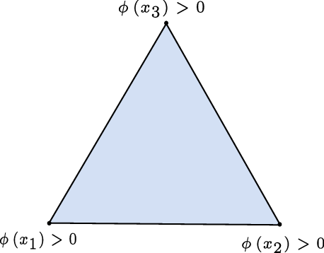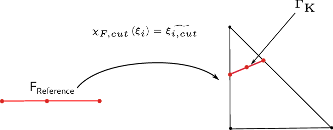 To integrate over the interface (or surface) parts \(\Gamma_K\), we use a similar technique to generate the quadrature rules. The important difference is here that the element used to generate the quadrature rule has a different dimension toe the reference element in which the quadrature rule is used. This means, we interpret the interface represented by an interval reference element as part of the triangular element. We map the integration rule from the standard reference interval (1D) to part of the triangle (2D). This mapping is mixed dimensional to generate the quadrature rule. An example of the approximation of the \(\Gamma_K\) integral as part of \(K\) is given in Figure 10.