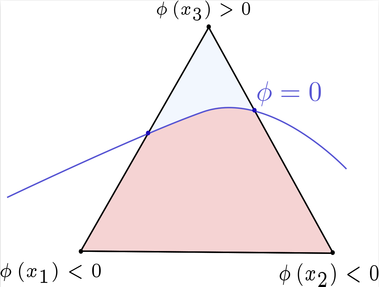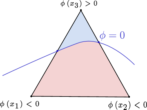 In our CutFEM approach, we represent the boundary as a sharp interface. As such, we reconstruct the zero level set contour line by computing linear cuts through the mesh elements. We then integrate on those resulting cuts (volume and boundary cuts) as detailed below. For simplicity explanations are given in detail for dimension two. As mentioned above, we use a level set function, \(\phi\), to describe \(\Omega\). We approximate \(\phi\) in a finite element space by interpolation, which we denote as \(\phi_h\). This means, using linear Lagrangian elements, \(\phi_h\) has one value in each vertex of the mesh, which we then use for cutting.