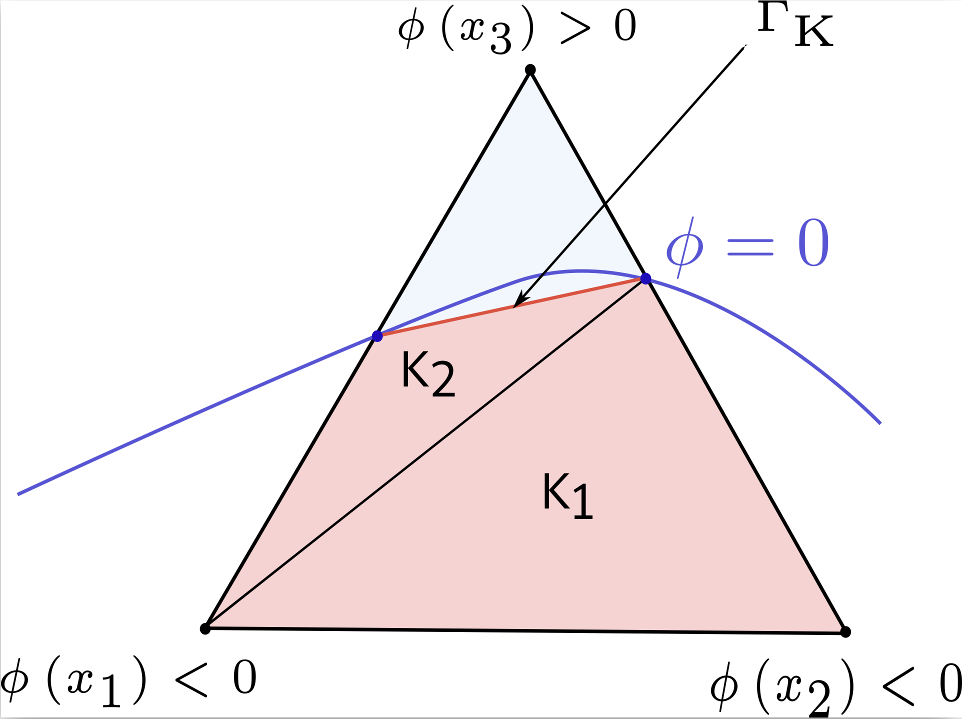 To reconstruct the interface in order to integrate over \(\Gamma_K\) and \(\Omega_K = \Omega_h \cap K\), a simple linear interpolation of level set values is used to calculate the points of intersection between the edges of the element \(K\) and the interface. Then we use these intersection points to obtain a linear approximation of \(\Gamma_K\) and \(K \cap \Omega_h\) (see Figure 7 and Figure 8).