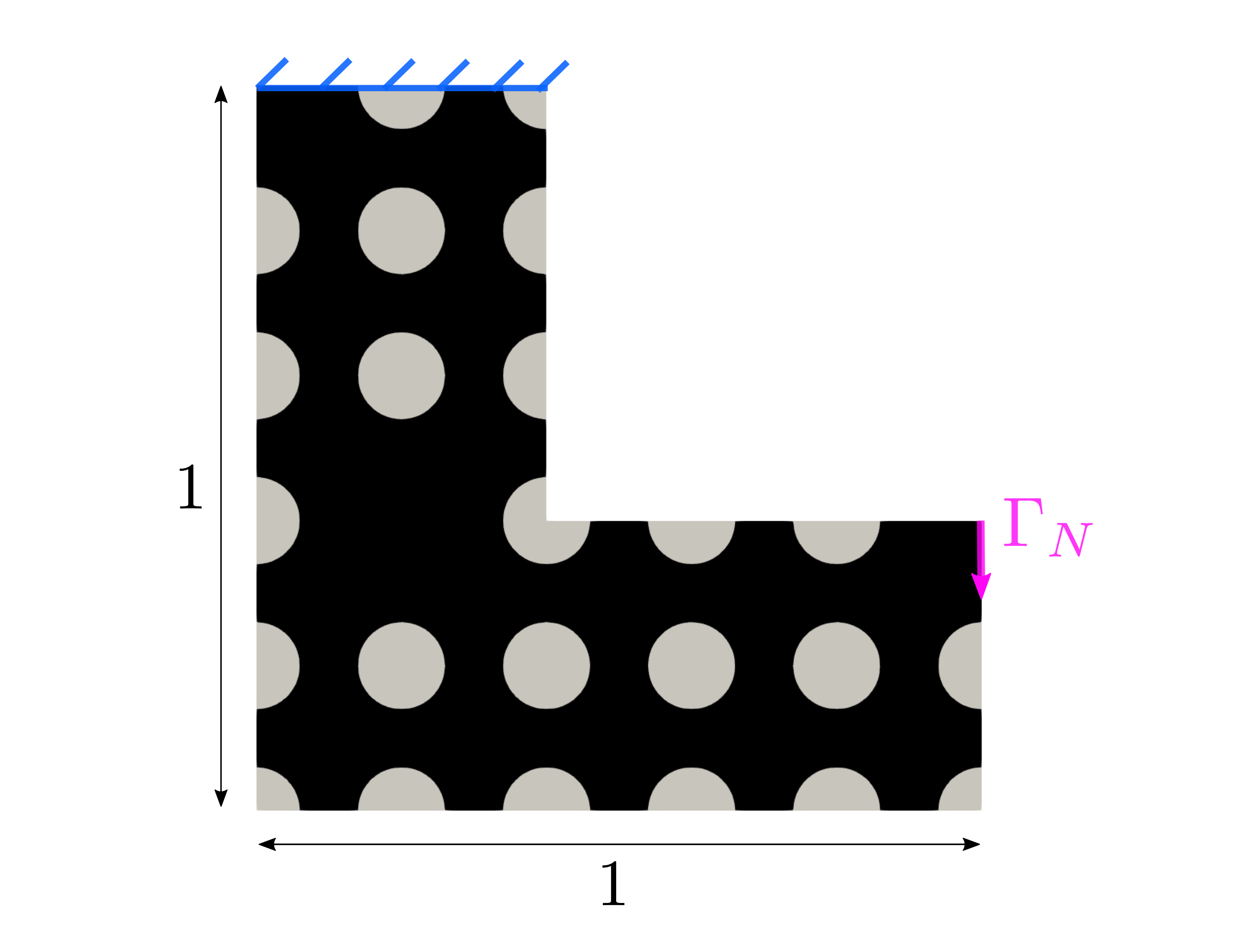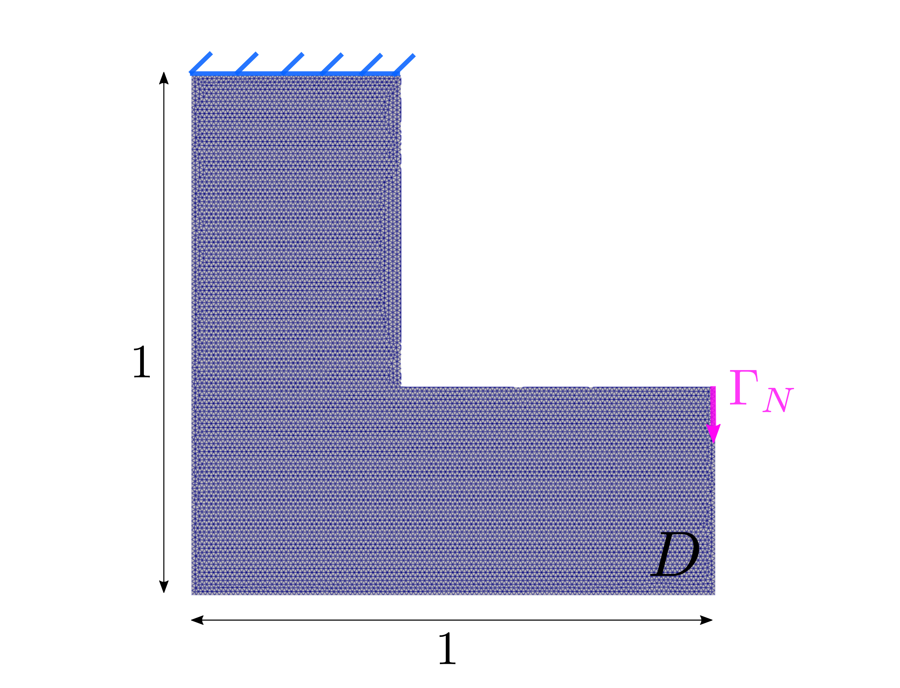 We study the case of non-self-adjoint problem. We consider an embedded steel beam of L shape of \(1\text{ m} \times 1\text{ m}\) subjected to a uniformly distributed tensile load in \(\Gamma_{N}\), such that \(g=-0.1 e_{y}\) GPa. We fixed \(p=10\) for the power of the Lp norm and we defined \(\overline{\sigma } = 3\). The numerical values used as parameters in the mechanical model are detailed in the Table bellow. The domain \(\Omega\) included in \(D\) is initialized as shown in Figure 24, and it is discretized with mesh size of \(0.01\) m as shown in Figure 25. The optimization problem is solved with a target area of \(0.3 \text{ m}^{2}\) and an initial area of \(0.45\text{ m}^{2}\). The optimal shape obtained is shown in CutFEM solution.